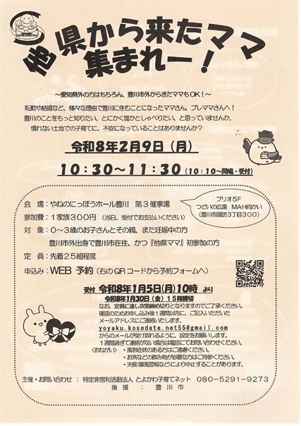 | 他県から来たママ集まれー! 2月9日(月) (特非)子育てネット | |