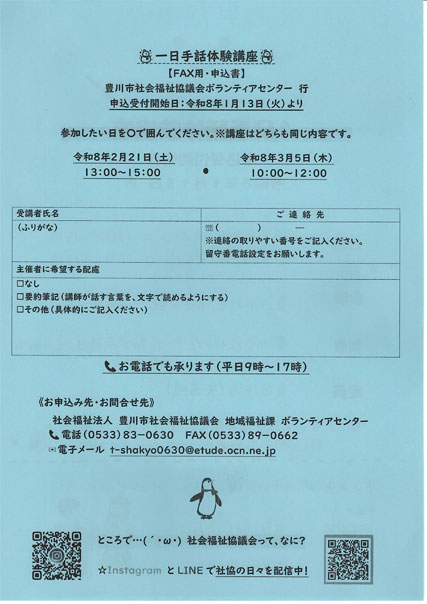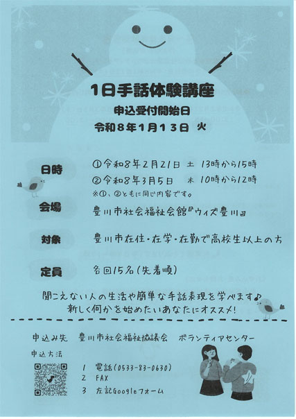 | 1日手話体験講座 1月13日(火) 豊川市社会福祉協議会 | |